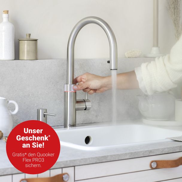 * Gratis Quooker Flex PRO3. Nur gültig auf frei geplanten Küchen ab einem Auftragswert von 9.900,- Euro. Gilt nur für Neuaufträge. Nicht kombinierbar mit anderen Aktionen, keine Barauszahlung möglich.