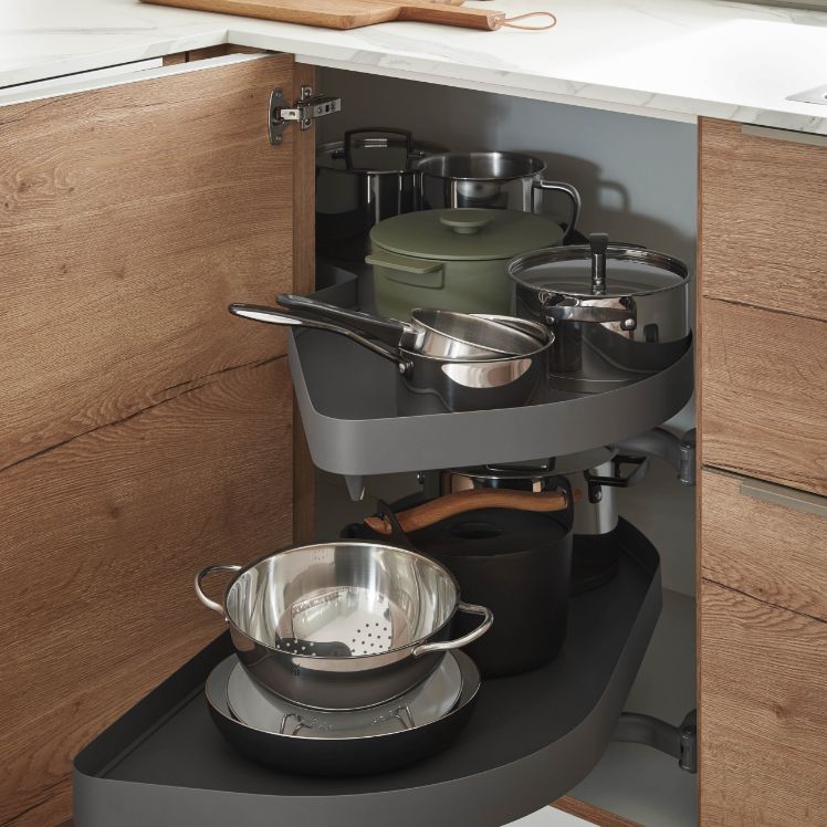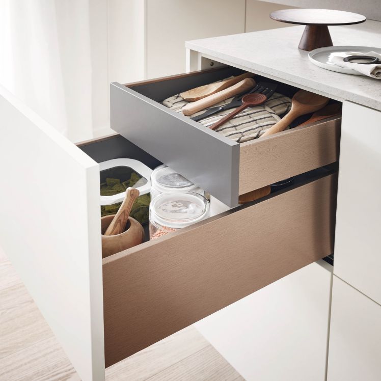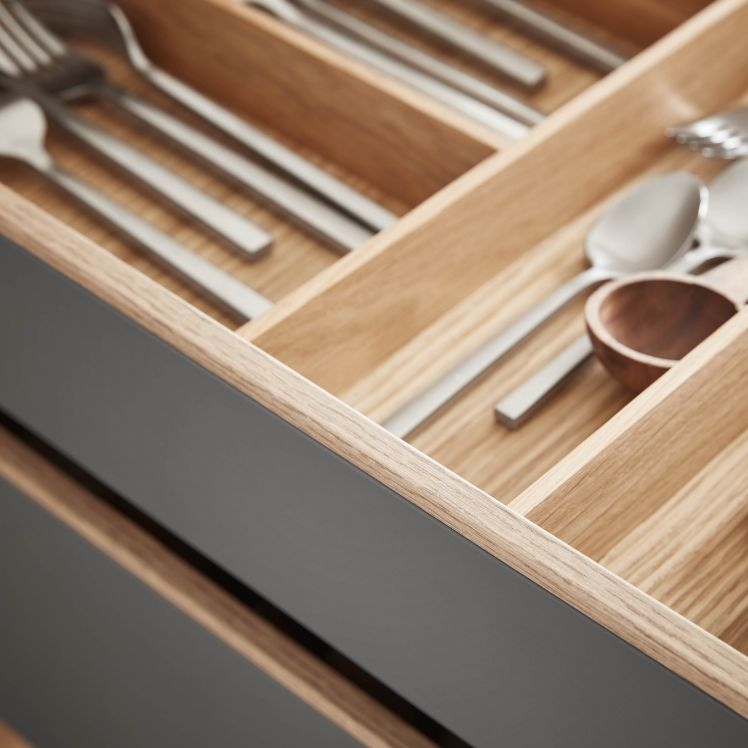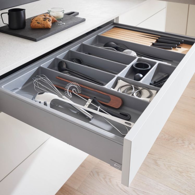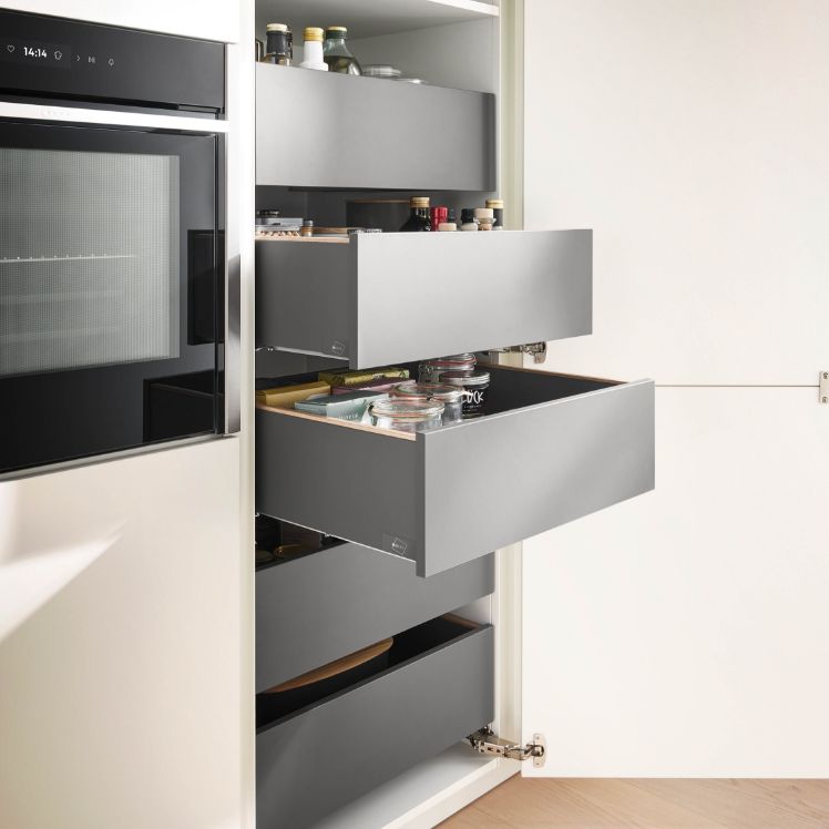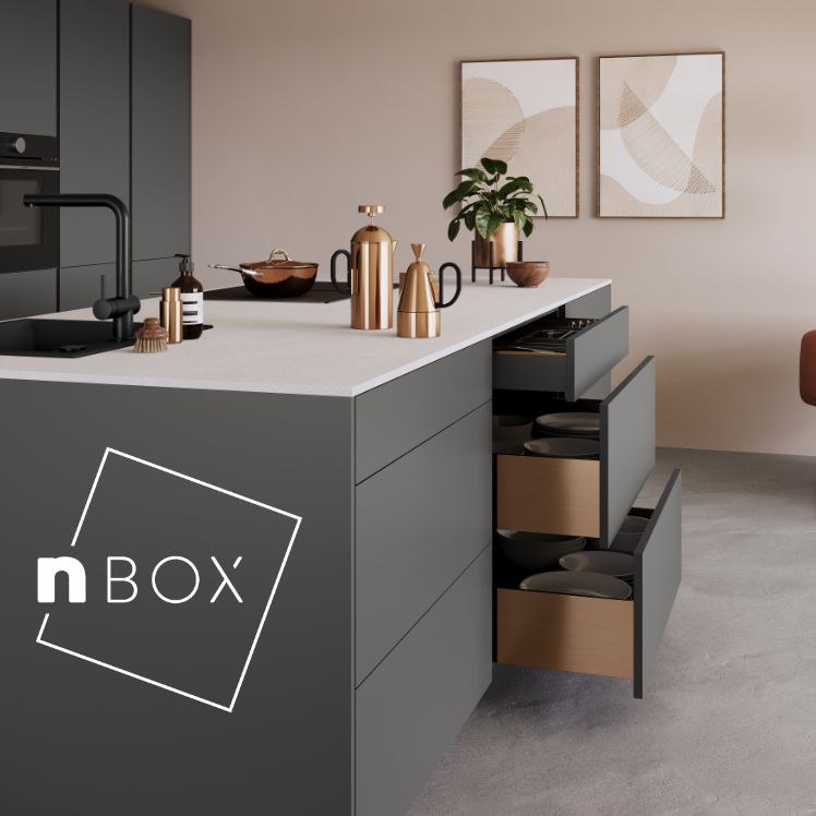 Mit nBOX werden neue Maßstäbe beim Schubkastensystem gesetzt. Als Serienstandard bietet es neben dem Premium-Design, auch mehr Komfort sowie durch Design-Cover und -Profile vielfältige Individuali- sierungsmöglichkeiten. Zusätzlich sorgt die Farbe Schiefergrau für eine elegante Optik des gesamten Interieurs. Die perfekte Lösung für Küche, Bad und Wohnen – ein funktionales System für alle Räume.