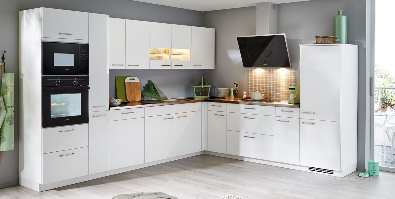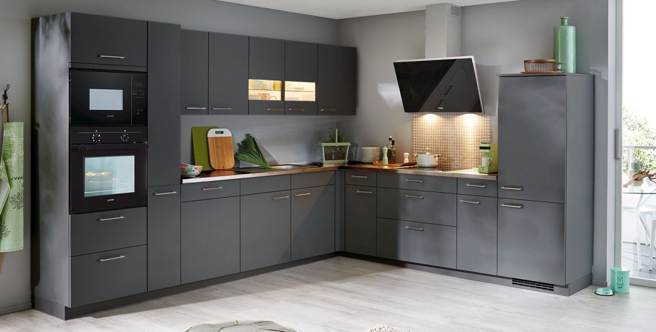 Inklusive Einbaubackofen schwarz Junker JF1300061 Energieeffizienzklasse A, Glaskeramik Kochfeld Junker JR36DT54, Designesse Edelstahl / Glas Airforce F162D2-80BK Energieeffizienzklasse C, Kühlschrank Laurus LKG88E Energieeffizienzklasse E, Mikrowelle Junker JP4119260, Einbauspüle Edelstahl Rodi Okio Line 85 Deep, XL-Schränken, Unterschrank mit Frontauszügen, Wandschrank mit Segmentglastüren, Geschirrschrank.