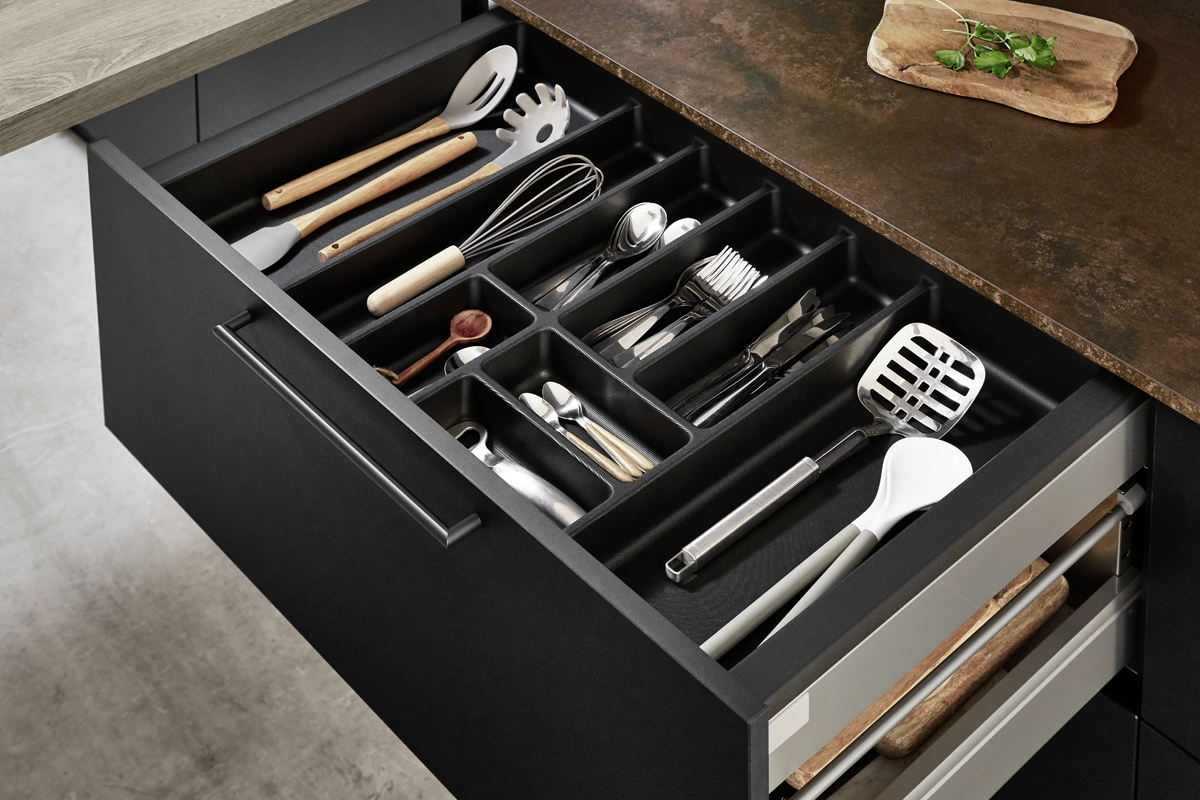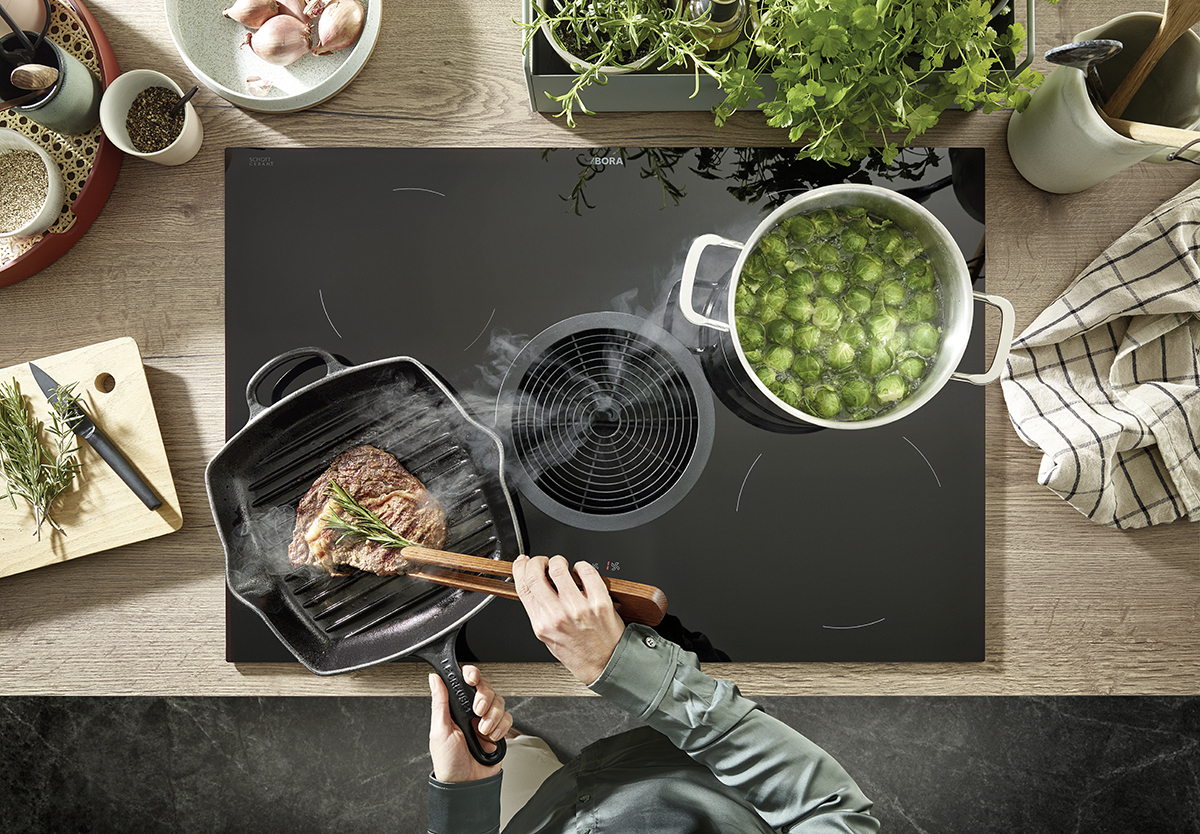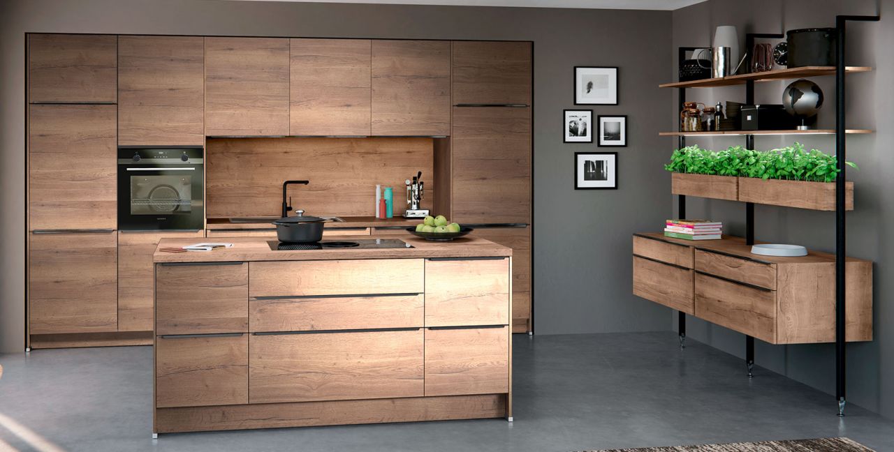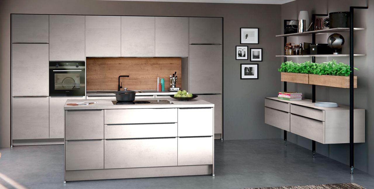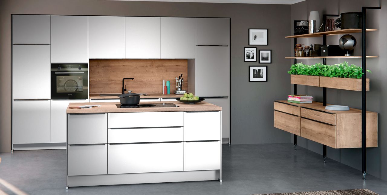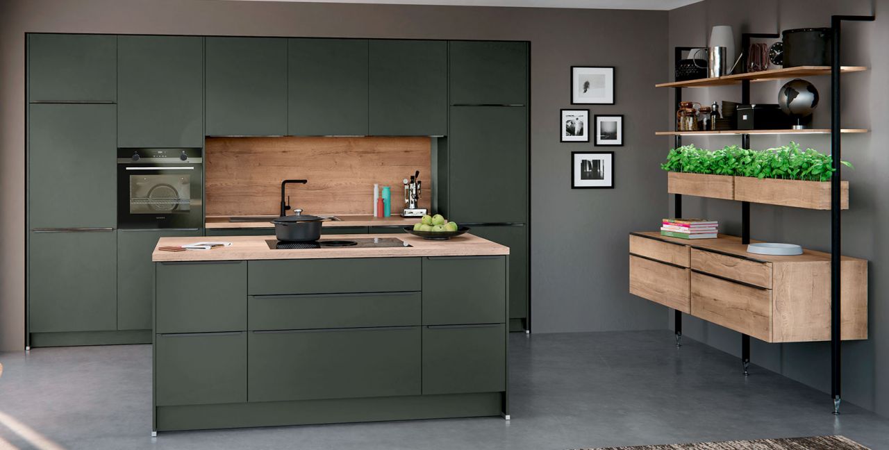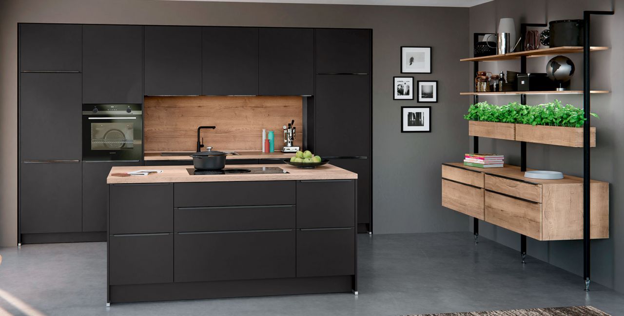 Inklusive Einbaubackofen Edelstahl Siemens HB517ABS0 Energieeffizienzklasse A, Glaskeramik Kochfeld mit Induktion und Kochfeldabzug (Umluft) Bora GP4U, Kühlschrank Laurus LKG88E Energieeffizienzklasse E, Einbauspüle Edelstahl Rodi Okio Line 85 Deep, Stollenregalsystem, Unterschränken mit Großraumauszügen.