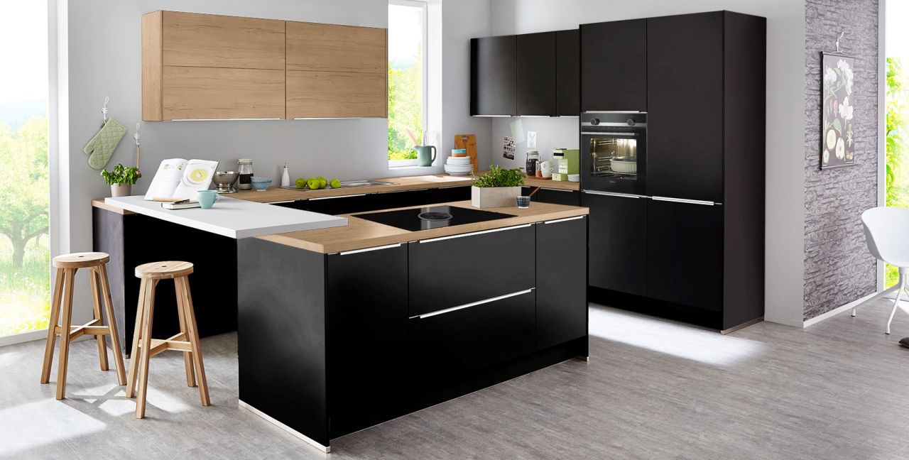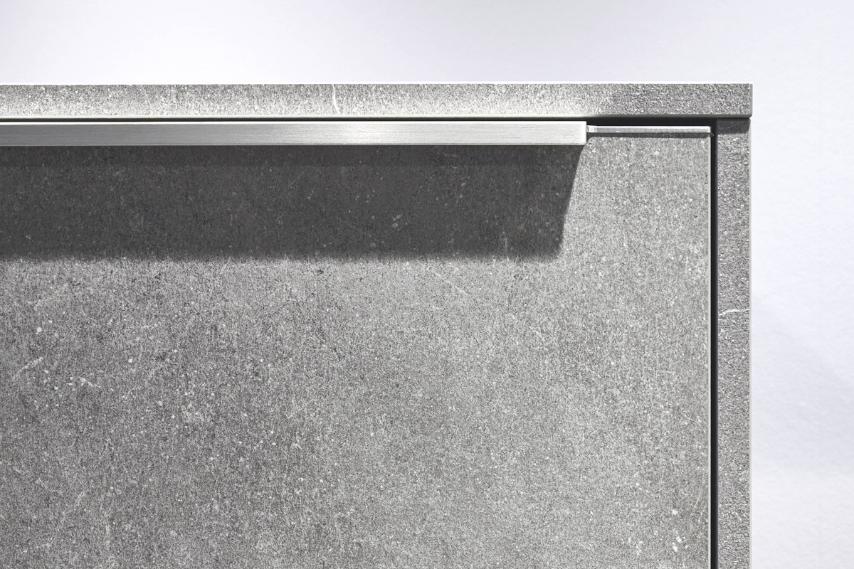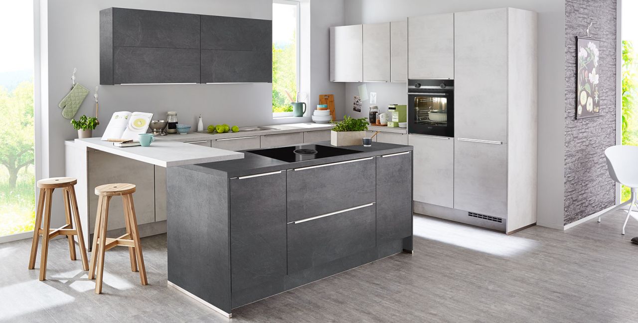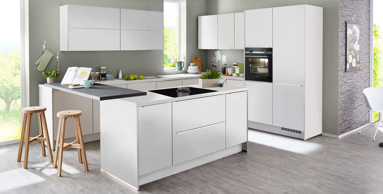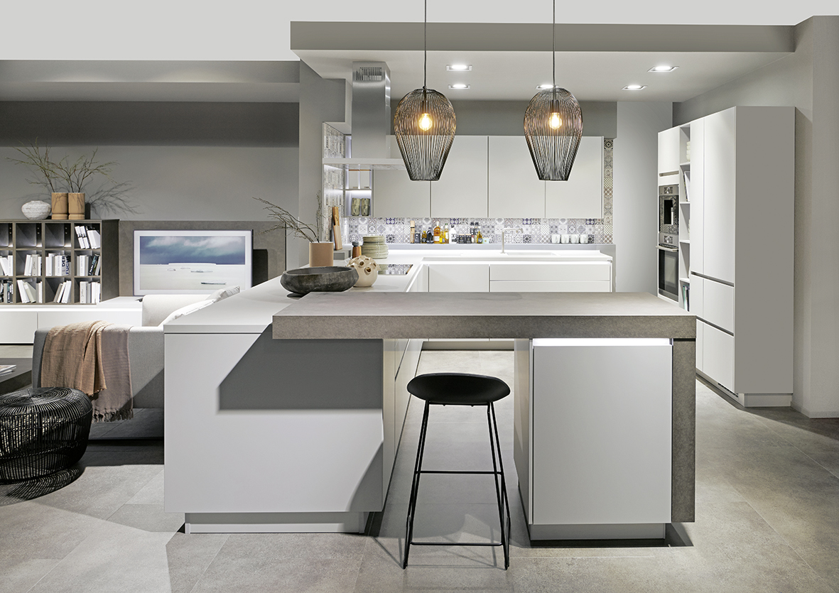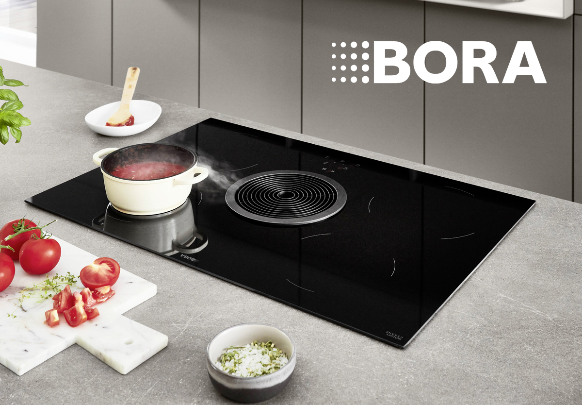 Inklusive Einbaubackofen Edelstahl Siemens HB510ABR1 Energieeffizienzklasse A, Glaskeramik Kochfeld mit Induktion und Kochfeldabzug (Umluft) Bora GP4U, Kühlschrank Laurus LKG88E Energieeffizienzklasse E, Einbauspüle Edelstahl Rodi Okio Line 85 Deep, Unterschrank mit Großraumauszügen, Wandschränken mit Falt-Lifttür, Esstheke.