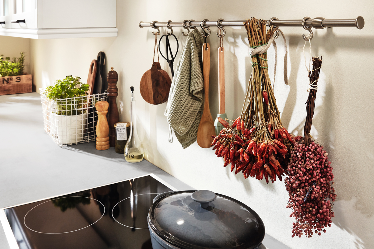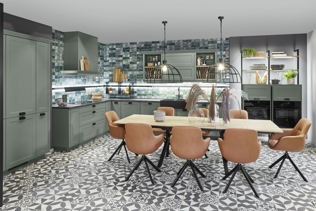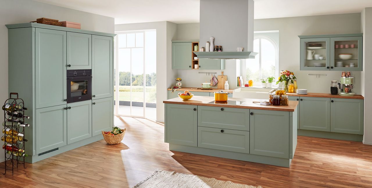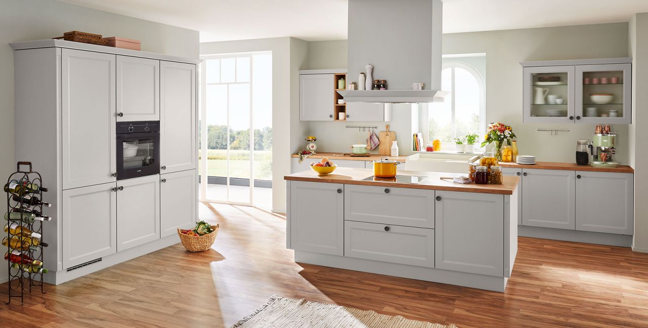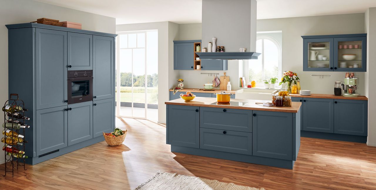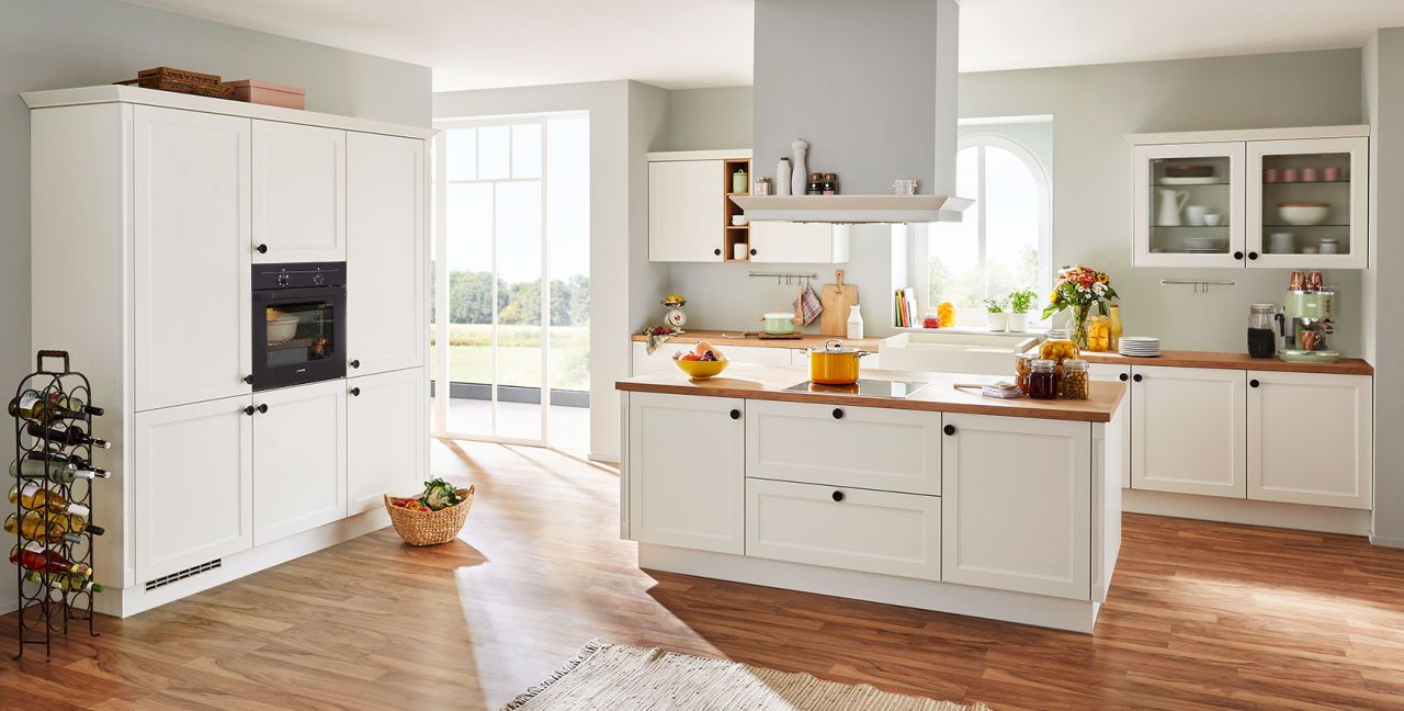 Inklusive Einbaubackofen schwarz Junker JF1300061 Energieeffizienzklasse A, Glaskeramik Kochfeld Junker JR36DT54, Landhauskamin mit Lüfterbaustein Airforce F96-90 Energieeffizienzklasse C, Kühlschrank Laurus LKG88E Energieeffizienzklasse E, Einbau-Designspüle Schock Grando M-100, Unterschrank mit Großraumauszügen, Wandschränken mit Glasrahmentür, Wandschrankregal.